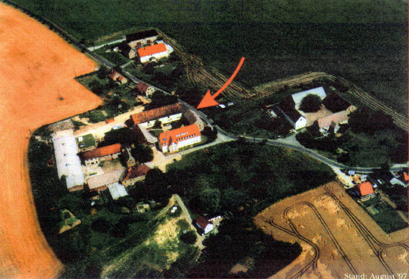 An der Lage der Vierseithöfe hat sich seit der Neugründung des Ortes nach dem verheerenden Brand um 1800 bis heute nichts geändert, wohl aber an ihrem Zustand und ihrer Geschlossenheit. Wie das Luftbild aus dem Jahre 1997 zeigt, hat allein der rechts im Bild liegende Hof die alten Strukturen in die Jetztzeit retten können, wohingegen beim Beegerhof in Bildmitte ein moderner Neubau an die Stelle des alten Wohngebäudes getreten ist. Kaum mehr zu retten ist der links (nördlich) angrenzende Melzerhof mit dem um 1920 hinzugefügten Herrenhaus, der seit Auszug des letzten Mieters zunehmend zerfällt. Auch wenn die abseits der Höfe errichteten, grundhässlichen Stall- und Lagergebäude aus LPG-Zeit mit einer Ausnahme (Großbau links im Bild) wieder verschwunden sind, die 40 Jahre währende Vernachlässigung der Bausubstanz hat Narben hinterlassen, die genauso wenig übersehbar sind wie die Zeugen der Neuzeit, die sich in Form moderner Einfamilienhäuser an die Durchgangsstraße legen und in ihrem schmucken Erscheinungsbild für die Umwandlung des Bauerndorfes zur Wohngemeinde stehen.